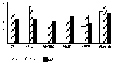 鹿児島大の場合は、自然系科目が板書の一項目を除いて、他は後期に評価が上昇している。他方人文系科学科目は、声の聞き取り易さのみが後期に上昇しないという傾向があった。