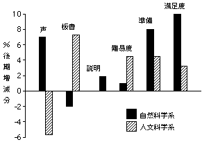 理工系・人文系の双方とも、「教員の声」「板書」「資料の用い方」「理解しやすいか」「教員の熱意」「説明の仕方」の評価の全項目が後期に高い。