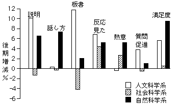 理工・農学系の教養科目と、人文系の科目の二つを比較する。縦軸は、新大の場合と同様に、回答項目@強く思う、Aそう思う、の二項目の%を合計した数値の後期の上昇分である。