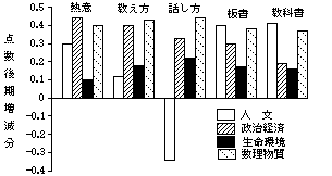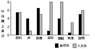 鹿児島大の場合は、自然系科目が板書の一項目を除いて、他は後期に評価が上昇している。他方人文系科学科目は、声の聞き取り易さのみが後期に上昇しないという傾向があった。