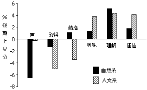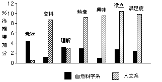 理工・農学系の教養科目と、人文系の科目の二つを比較する。縦軸は、新大の場合と同様に、回答項目@強く思う、Aそう思う、の二項目の%を合計した数値の後期の上昇分である。