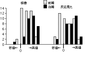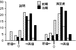 図7に見事に現れているように、前期では評価点の低い領域に相当数の科目が分布し、後期では逆に値の高い領域に、科目が移動する。